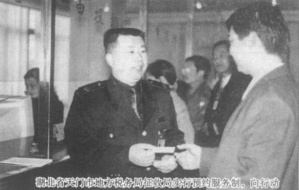 湖北省天门市地方税务局征收局实行预约服务制,向行动不便的老年人、残疾人等纳税人进行上门办税服务。图为该局领导向纳税人发放“预约服务卡”。