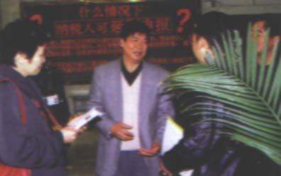 新疆维吾尔自治区克拉玛依市地方税务局采用报纸电视公告、电子大屏幕显示等多种形式向纳税人宣传办税公开制度,收到了良好的效果。最近,市政府纠风办对执法部门进行的行风复评中,地税局再次名列第一。图为该局领导在向行风评议组的同志介绍情况。