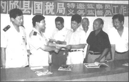 河北省内邱县国家税务局为了让所聘请的特约监察员、义务监督员及时了解税法和税收动态,更好地监督国税工作,免费为他们订阅税务报刊。图为该局领导向他们赠送2002年《中国税务》杂志订单。