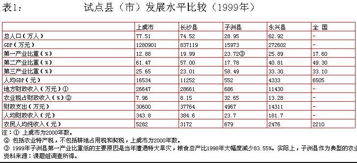 改革前,上述试点县(市)中,上虞市和长沙县不仅地方预算收入较高,而且由于县(市)级经济较为发达,县(市)级财政状况较好,相对较少地通过财政体制来集中乡镇财政收入,这使得这些县(市)在进行农村税费制度改革时要比其他试点县所面临的困难和压力相对小些。