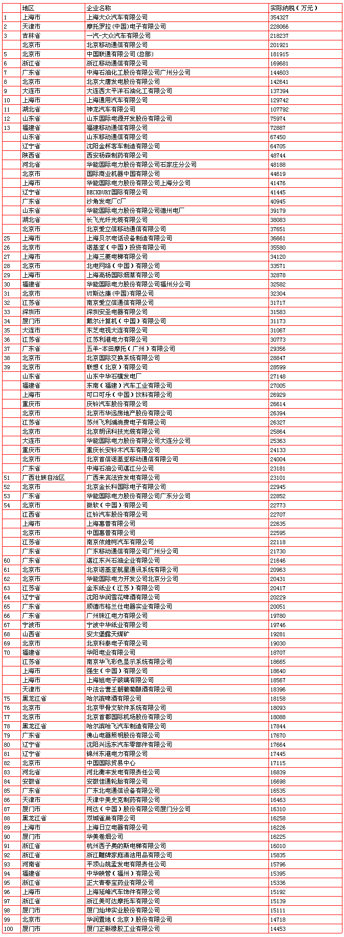 2001年度中国外商及港澳台商投资企业纳税百强排行榜