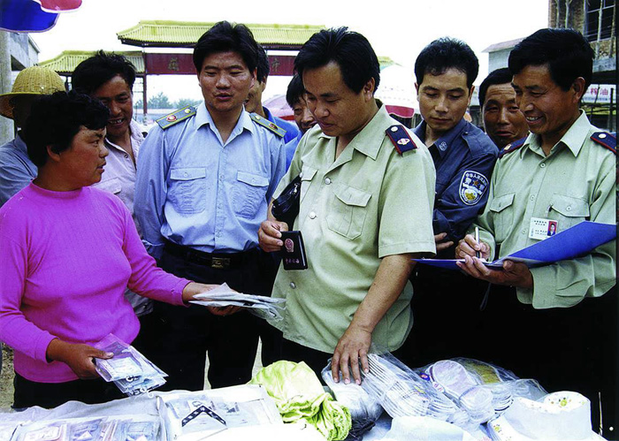 江苏省丰县国家税务局联合工商、公安等部门,对辖区内的市场进行清理整顿,依法查处了一批偷、逃、骗、抗税人员,挽回了国家的损失,维护了合法经营,受到诚信纳税户的欢迎。图为执法人员在农贸市场进行检查。