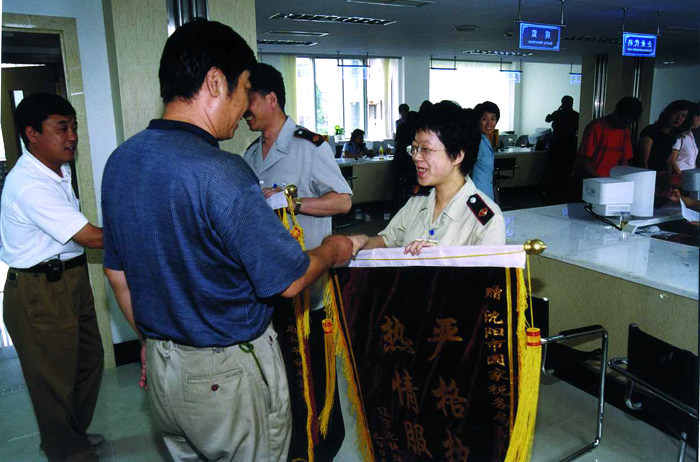 辽宁省沈阳市国家税务局和平分局开展“限时服务”“延时服务”和“即时服务”等活动,优质高效地为纳税人服务,受到纳税人的好评。图为纳税人向该局赠送“严格执法,热情服务”的锦旗。