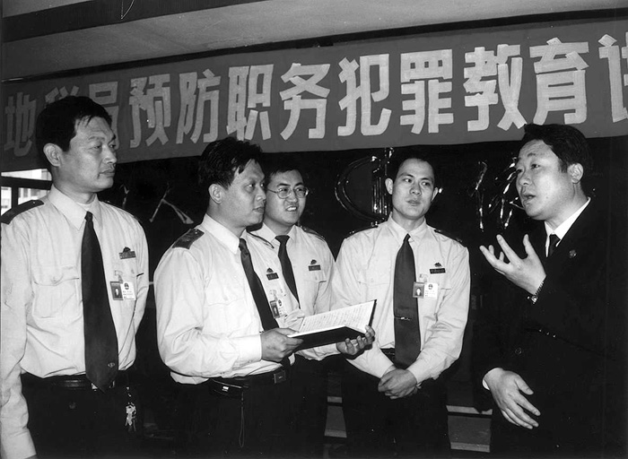 山东省枣庄市山亭区地方税务局强化党风廉政建设工作,坚持“关口前移,预防为主”的方针,定期聘请检察院、法院等政法机关的法律专家对税务干部进行法制教育。图为检察院副检察长在“预防职务犯罪”讲座后与税务干部交流学习心得。