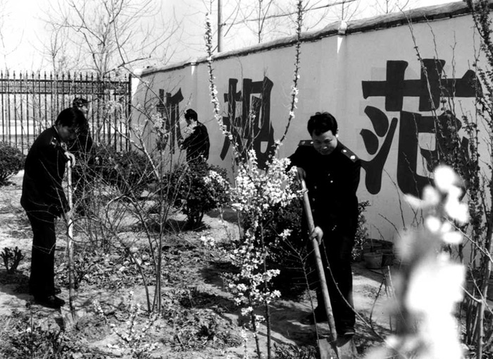 江苏省丰县国家税务局赵庄分局,注意对环境的绿化美化,不断提高环境质量,使分局内春有花、夏有荫、秋结果、冬披翠。图为职工们在工作之余给花草松土施肥。