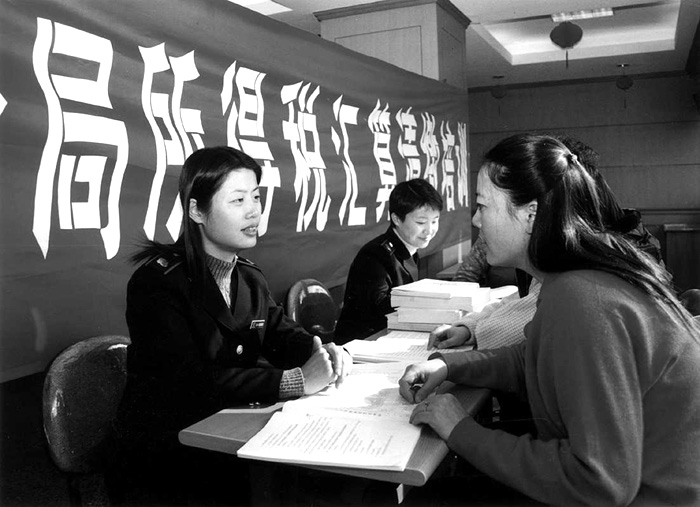 江苏省南京市地方税务局结合贯彻新的《税收征管法》工作,在全市举办了企业所得税汇算清缴培训,受到了企业财务人员的欢迎。图为玄武稽查分局税务人员在培训结束后接受纳税人的咨询。