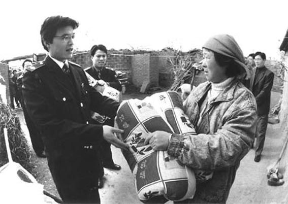 江苏省赣榆县地方税务局积极开展扶贫济困送温暖活动,发动干部职工捐款捐物,帮助特困户解决实际困难,使他们在严寒的冬季里切身感受到党和政府的温暖。图为该局税务人员登门为特困户送棉被。