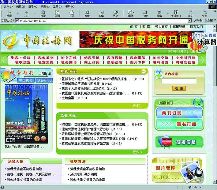 中国税务网以财税经济为主线,服务于征纳双方。主要内容有:财税经济要闻、企业排行榜、税收法规、税收征管、国内外税制简介、税收筹划、税务论文、网上订阅、图片库等。欢迎关心税收事业的网友在网上投稿、在税收论坛发表意见,并通过网络订阅《中国税务》、《税务研究》及财税书籍。