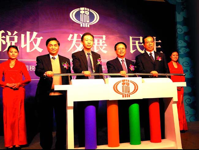全国人大常委会副委员长陈昌智(左三),国家税务总局局长肖捷(左二),全国普法办副主任、司法部副部长张苏军(左四),教育部部长助理杨周复(左一)共同按动税收宣传月启动杆,拉开了第17个全国税收宣传月活动的序幕。