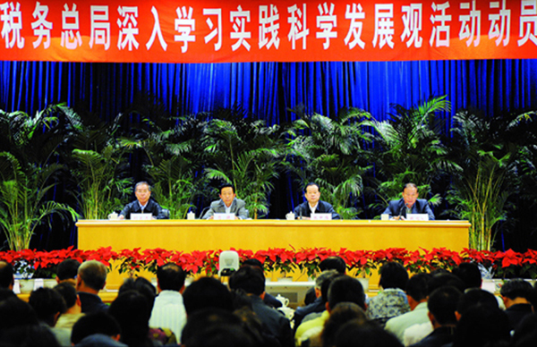 中国税务 2008年 第12期 简讯 贯彻落实科学发展观 促进税收事业新发展 ——国家税务总局深入学习实践科学发展观活动集锦 上一篇 下一篇 图片说明:(2)国家税务总局党组书记、局长肖捷在总局深入学习实践科学发展观活动动员大会上作动员报告。(3)中央学习实践活动指导检查组组长张中伟在总局深入学习实践科学发展观活动动员大会上作重要讲话。 >>阅读全文