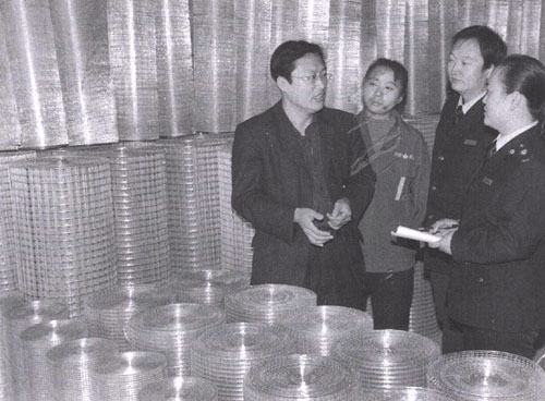 全球金融危机对我国以出口为导向的外向型经济造成严重的冲击。针对这一现状,山东省商河县国家税务局干部主动深入出口企业,帮助他们出谋献策,以开拓更广阔的国内外市场。图为该局税务干部在生产车间了解产品的生产销售情况。
