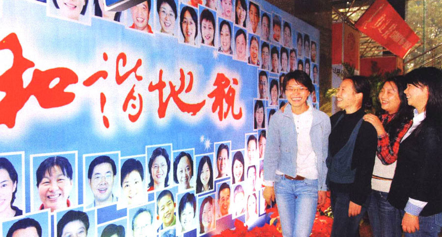 江苏省地方税务局在办税区域竖起由税务人员、纳税人和学生等代表组成的百人笑脸墙,促进征纳和谐互动。