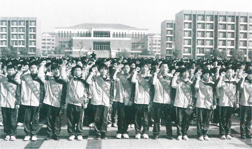 2010年3月31日,安徽省天长市地方税务局与天长中学联合举办“我与税收宣传月同龄、同行”主题宣传活动。该校与全国税收宣传月同龄的190名19岁中学生被聘为“税收义务宣传员”。图为“税收义务宣传员”面对税徽进行庄重的上岗宣誓。宣誓后,“税收义务宣传员”们登上公交车沿途进行税法宣传。