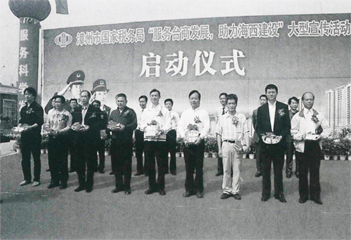 在以“税收·发展·民生”为主题的第十九个税收宣传月活动中,福建省漳州市国家税务局组织开展了“情系台商,服务发展”宣传活动。该局在漳浦台湾农民创业园举办了“服务台商发展,助力海西建设”大型宣传活动启动仪式。图为在启动仪式上,该局向部分台资企业家代表赠送有关税收政策、纳税服务等税收宣传资料。