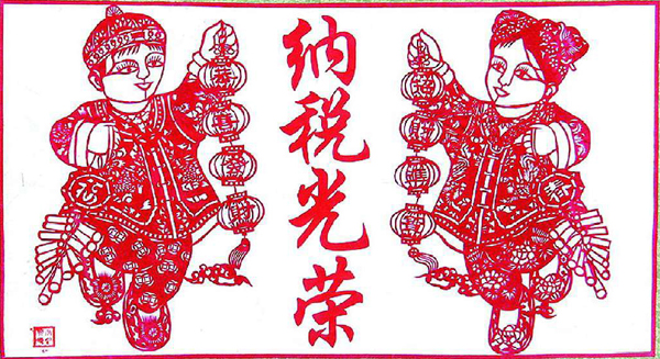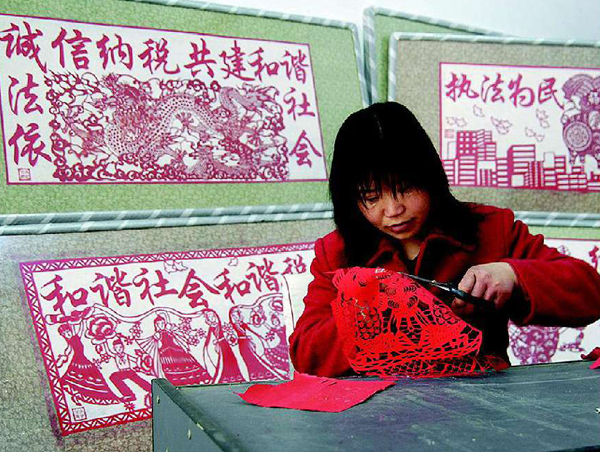 农民剪纸艺术家张月英为“税收宣传月”活动剪纸