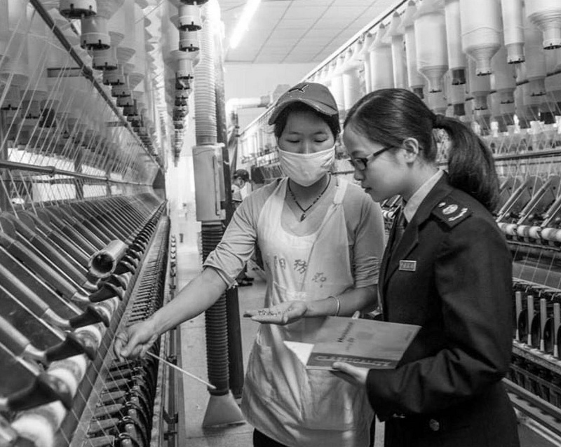 江西省上高县地方税务局通过企业申报表和日常管理信息对比分析,加强企业所得税管理。图为税务干部在某纺织企业了解生产情况。
