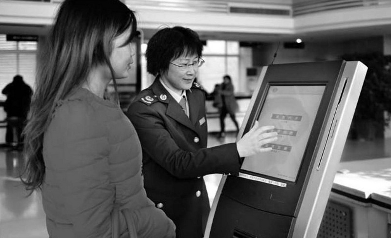 安徽省安庆市国家税务局在办税服务厅引入电子服务评价管理系统,提升办税效率。图为税务干部辅导纳税人熟悉办税流程。
