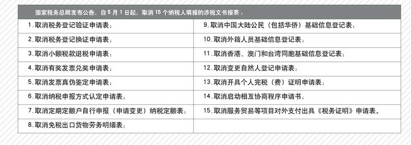 国家税务总局取消15个纳税人填报的涉税文书报表
