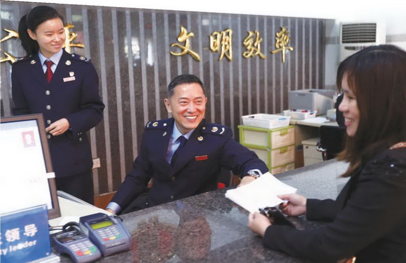 武汉市国税局局长刘崇俊(中)在基层办税服务厅窗口为纳税人办税。
