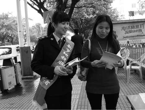 福建省龙岩市新罗区地方税务局组织志愿者参加“弘扬雷锋精神 建设生态文明家园”为主题的志愿服务一条街活动。图为志愿者现场发放税收宣传资料,接受纳税人咨询。