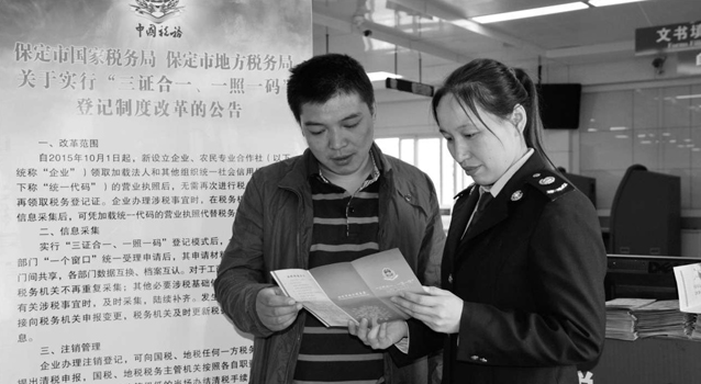 中国税务 2015年 第12期 图片新闻 图片新闻 上一篇 下一篇 10月1日起,全国统一实施企业登记注册“三证合一”登记制度。河北省保定国家高新技术产业开发区地方税务局通过设立咨询台、编制办税流程手册、张贴公告等形式,对“三证合一、一照一码”登记制度进行宣传,确保现有登记模式向“三证合一、一照一码”登记模式平稳过渡。(图片新闻责任编辑:黄诗睿)