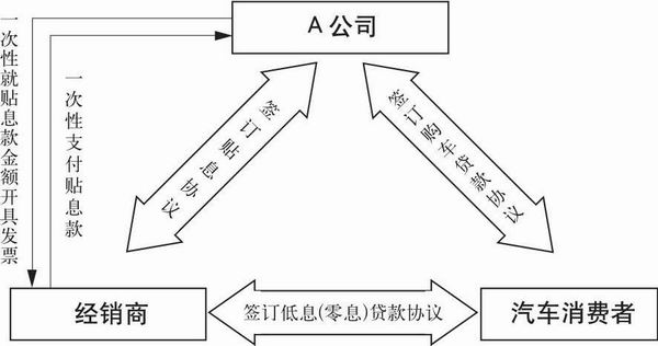 当汽车消费者在购买汽车时选择了低息(零息)的贷款购车服务方案,并与汽车经销商签订低息(零息)购车协议后,汽车消费者要与a公司签订购车贷款协议,以获得资金的支持,并根据协议约定按期偿付本金和利息。由于a公司在与汽车消费者签订的购车贷款协议中执行的是经销商承诺给消费者的低息(零息),因此,经销商需要就利息差对a公司进行补偿(a公司称其为利息贴息,以下简称“贴息”),双方签订贴息协议。