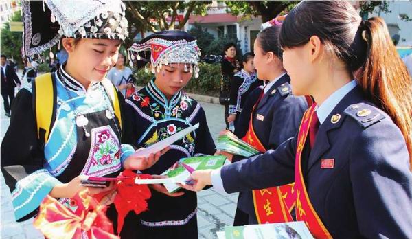 贵州省黔西南布依族苗族自治州册亨县国家税务局、地方税务局联合在当地赶集日开展税收宣传。图为税务干部向少数民族群众发放税收宣传资料。