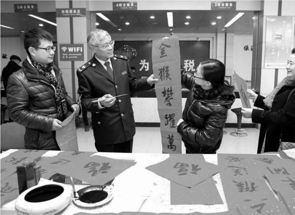 中国税务 2016年 第3期 图片新闻 图片新闻 上一篇 下一篇 春节前夕,江西省高安市地方税务局组织该局书法爱好者在办税服务厅现场写春联,赠送给前来办税的纳税人,以此感谢纳税人对税收工作的理解和支持。
