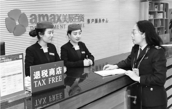 云南省昆明市国家税务局干部正在为退税商店的柜台人员讲解如何为纳税人办理退税手续。