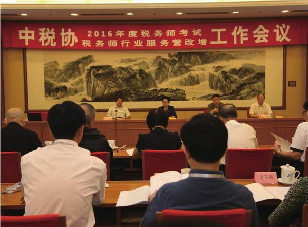 2016年6月7日,“2016年度税务师考试”、“税务师行业服务营改增”工作会议在北京召开。会议落实国家税务总局局长王军关于税务师行业要为营改增增砖添瓦、拾遗补缺的批示精神,研究制定了《税务师行业服务营改增行动方案》及成立营改增课题组、专家组事宜,同时,对2016年度税务师职业资格考试工作进行了部署安排。中国注册税务师协会会长宋兰出席会议并讲话,出席会议的还有全国人大常委、财经委员会副主任、中税协副会长郝如玉,全国政协委员、中税协副会长、尤尼泰税务师事务所总裁蓝逢辉,中税协副会长、中汇税务师事务所董事长余强。会议由中税协副会长兼秘书长李林军主持,全国各地注册税务师协会会长、税务师事务所代表共100余人参加了会议。