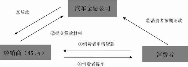 汽车金融公司是指经中国银行业监督管理委员会批准设立的,为中国境内的汽车购买者及销售者提供金融服务的非银行金融机构。在传统汽车销售模式下,汽车生产厂商直接或者通过经销商(4s店)把汽车卖给个人消费者。而在汽车金融消费贷业务中,为了刺激消费者购车,汽车销售行为涉及三方当事人,分别为汽车生产商或经销商(4s店)、汽车金融服务公司、个人消费者,如下图所示: