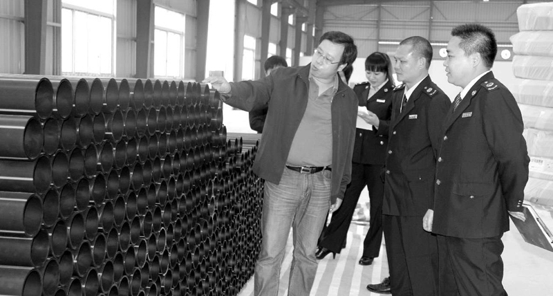广西壮族自治区平果县国家税务局加强重点税源企业管理,图为税务干部深入企业核实产品销售情况。