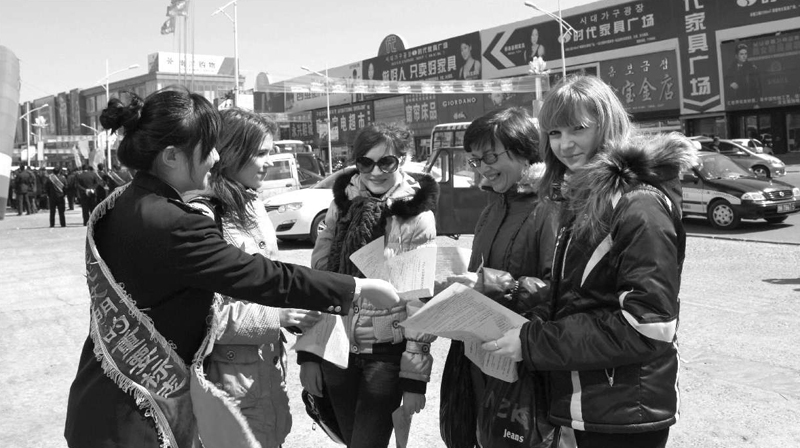 吉林省珲春市国家税务局运用中俄双语开展税收宣传活动,助力外贸发展,图为税务干部向外国客商讲解税收政策。