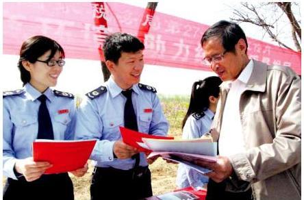 山西省稷山县国家税务局干部在稷山县“花海清河”第二届桃花节上,向游客宣传税收政策。 王正亭 文/图