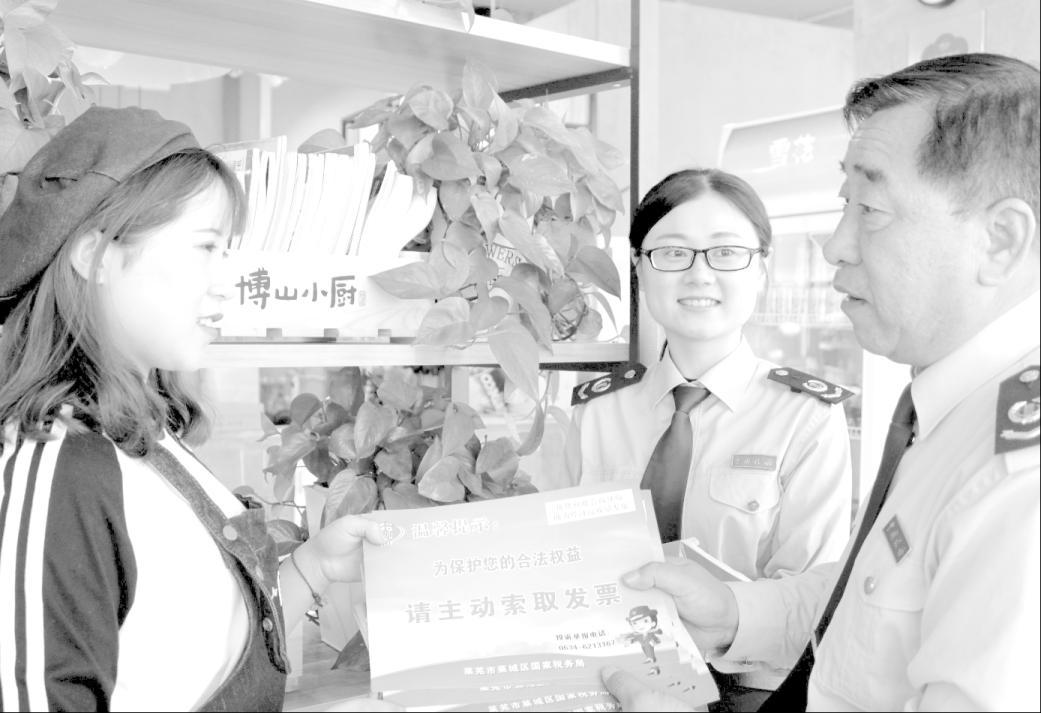山东省莱芜市莱城区国家税务局在辖区内个体商铺张贴“请主动索取发票”宣传单页,营造诚信经营、依法纳税的社会环境。