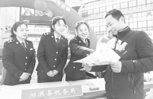 国家税务总局泗洪县税务局向纳税人宣传减税降费税收优惠政策。韩 夏 秦 燕 文/图