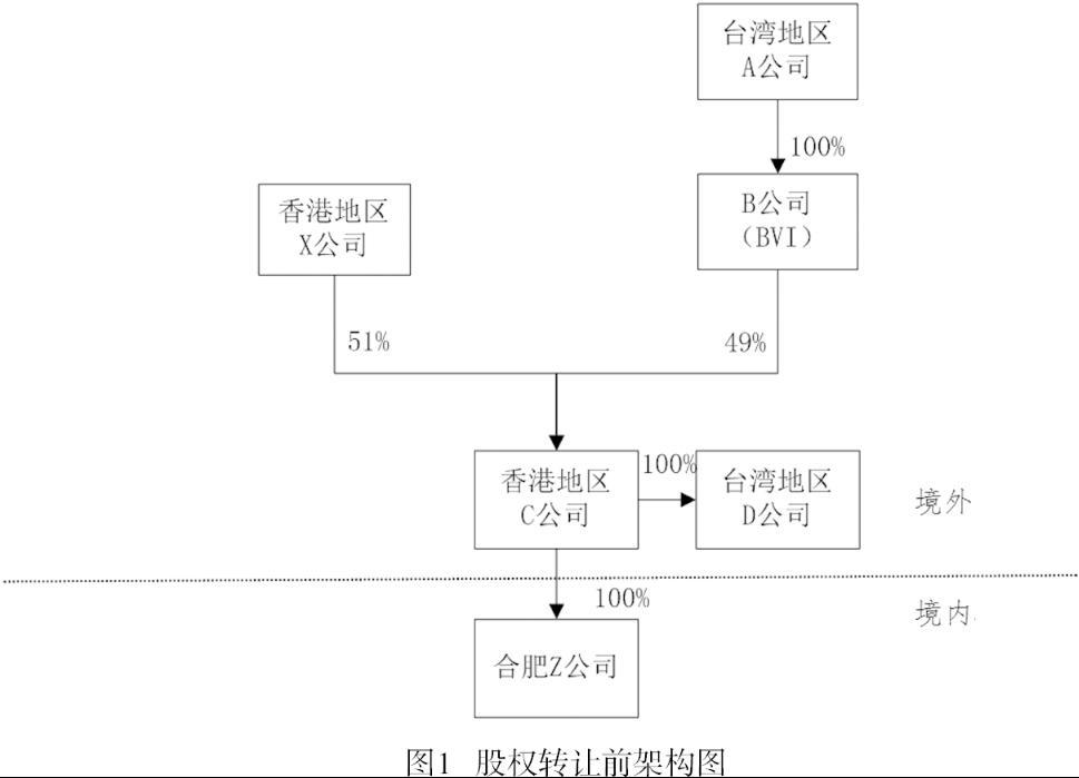 2018 年8 月,中国台湾地区a 公司(以下简称“台湾地区a 公司”)及其下属英属维尔京群岛(bvi)b 公司(以下简称“b 公司”)与中国境内合肥y 有限公司(以下简称“合肥y 公司”)签订股权转让合同,b 公司将其持有的中国香港地区c 公司(直接转让标的,以下简称“香港地区c 公司”)49% 的股权转让给y 公司,从而间接转让了中国境内合肥z 公司(间接转让标的,以下简称“z 公司”)100% 的股权,股权架构见图1、图2。