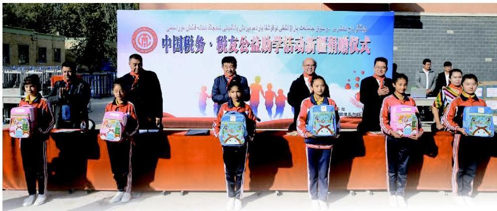 2019 年10 月11 日,由中国税务杂志社和国家税务总局新疆维吾尔自治区税务局主办,税友集团、领先未来集团、齐心集团联合支持的中国税务?税友公益助学活动在新疆维吾尔自治区墨玉县乌尔其乡中心小学举行。此次活动是税务公益助学活动第八站,共向阿克苏、喀什、和田3 地的13 个贫困村学校捐赠30 台笔记本电脑、1 200 套书包及学习用品、1 100 套桌椅台灯等价值上百万元的物资。