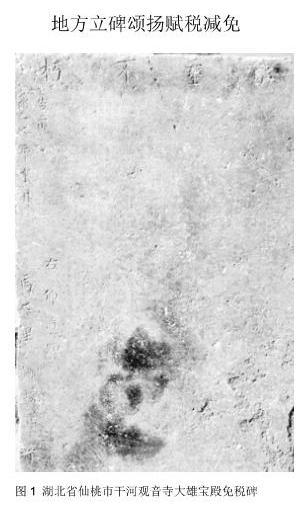 2002 年,位于仙桃市干河的观音寺大雄宝殿施工期间,发现一块免税碑(见图1),2019 年寺庙改建,经浙江财经大学教授赵映诚考证,认定其为咸丰七年(1857)的蠲免税费碑,距今已有162 年。