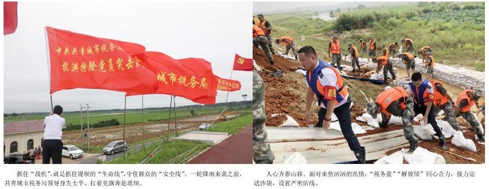 中国税务 2020年 第8期 税人税事 决战汛情 旗帜飘扬 ◎ 周璋豪 上一篇 下一篇 今年7 月,受持续强降雨和长江上游水情影响,江西抗洪防汛形势十分严峻。汛情就是命令,汛情就是战情。国家税务总局江西省共青城市税务局党委第一时间组织中青年干部,组建抗洪抢险党员突击队,深入汛情一线,抢在汛情之前加固堤坝、“围堵”险情。