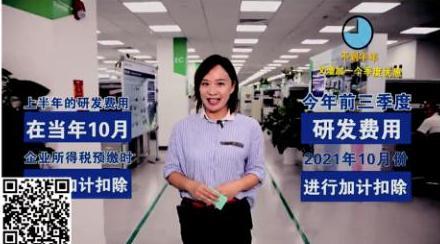 中国税务 2021年 第11期 短视频 2分钟了解研发费用加计扣除新政策 上一篇 下一篇 今年9月,国家税务总局发布了《关于进一步落实研发费用加计扣除政策有关问题的公告》,促进企业提前享受研发费用加计扣除优惠,增加流动资金,缓解资金压力,减轻办税负担。新政策都有哪些亮点呢﹖一起来了解下吧。策 划 国家税务总局上海市税务局 朱礼庆 >>阅读全文