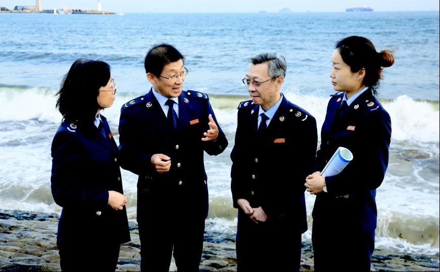 黄伟(左二)带领专案组人员到青岛某集装箱码头开展实地调研。