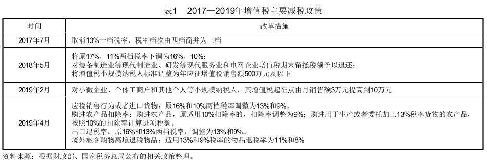 理论上,以流转税为主体的税制结构有利于效率目标的实现,但鉴于流转税属于间接税,具有累退性质和税负转嫁属性,其税收负担的分配取决于商品的供求弹性或生产者与消费者之间、上下游企业之间的议价能力。从消费者的角度看,在居民收入水平不变的情况下,当企业可以通过提高商品销售价格将税负成本转嫁给消费者时,将提高消费成本、抑制居民的消费需求。受边际消费倾向递减规律影响,收入水平越低的群体消费支出占收入比重越高,反而承担更多的税收负担。从企业的角度看,税负转嫁能力强的企业具备议价优势,可以灵活地改变销售价格或采购成本来拓宽利润空间,而对于议价能力弱、税负转嫁能力差的企业,以增值税为代表的流转税税负上升只能进一步压缩其经营利润,减少现金流。此外,增值税的顺周期性也意味着其不能很好地起到经济调节作用,进而影响财政“自动稳定器”功能的发挥。因此,调整增值税税率、降低增值税税负是降低宏观税负的重点(6),也是降低间接税比重、优化税制结构的基础。在具体措施方面(详见表1):2017 年7 月,增值税税率档次由四档简并为三档;2018年5 月,下调两档增值税税率,对部分企业增值税期末留抵税额予以退还,调整增值税小规模纳税人判定标准;2019 年2 月,提高增值税小规模纳税人起征点;2019 年4 月,再次下调增值税税率。
