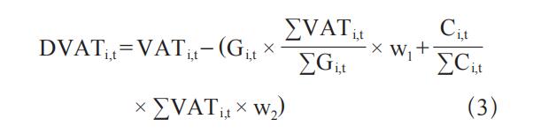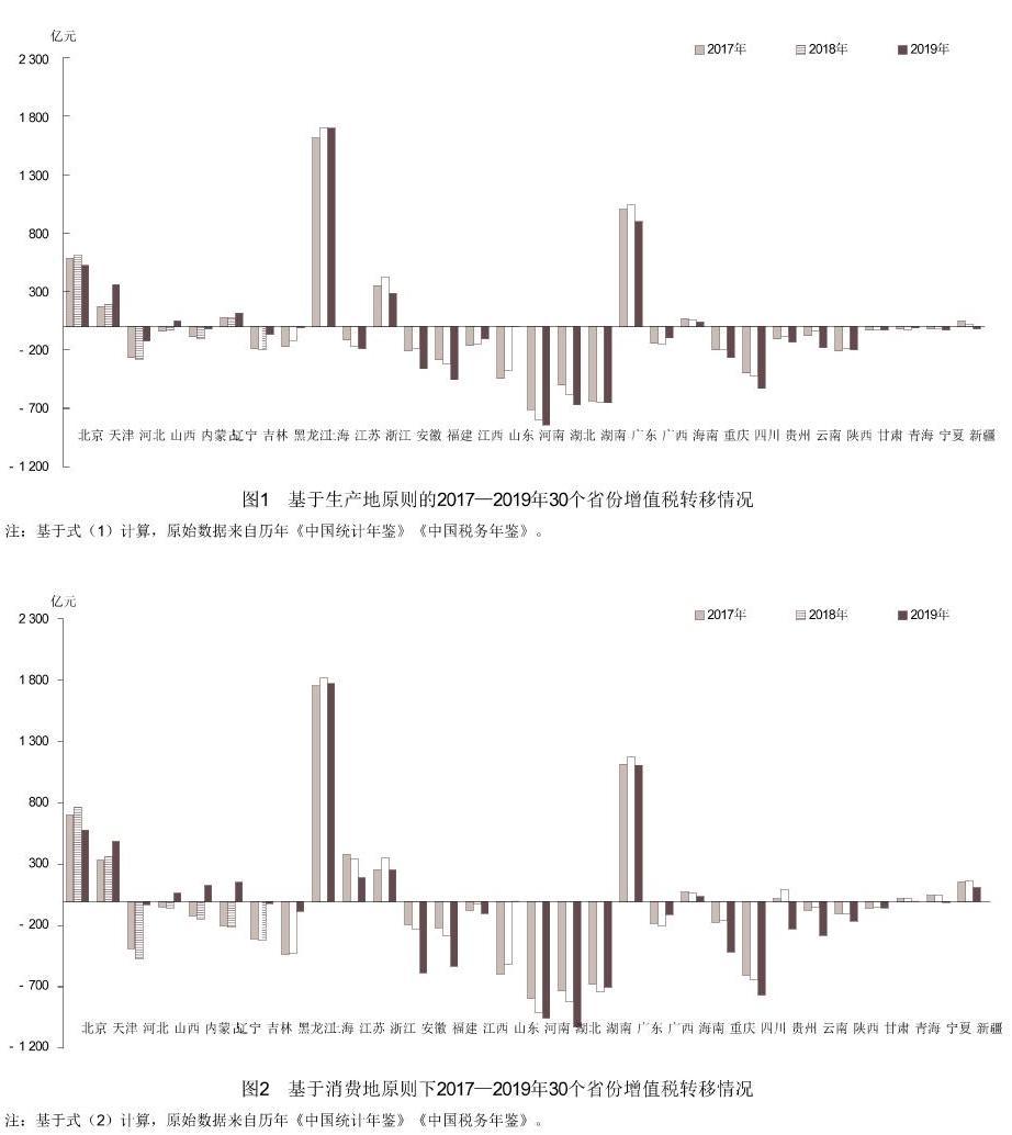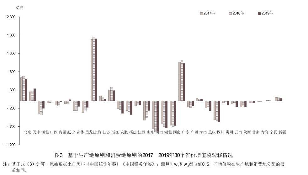 此外,基于价值创造计算政府资献的思路,生产地和消费地都应分享增值税收入,这里同时基于生产地原则和消费地京则来测算增值税转移。计算公式见式(3)。