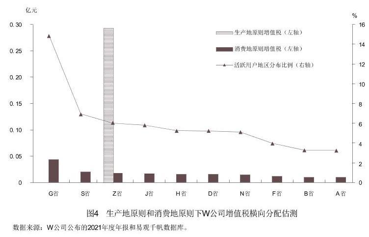 图4 的结果显示,生产地原则下,W公司机构所在地Z 省分享了增值税地方分享部分的全部;如果增值税横向分配采取消费地原则,Z 省仅可分享W公司增值税地方分享部分的大约6%。此案例直观地表明,数字经济时代采用生产地原则或机构所在地原则征收和分配增值税,会造成增值税地区间分配的横向失衡和严重不公。