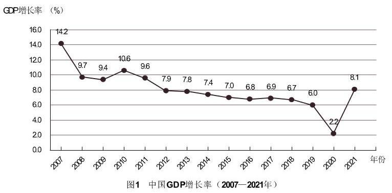 从经济增速情况看,可以将2008年以来我国的宏观经济运行大体划分为三个阶段。第一个阶段为2008 年 至2011 年,受国际金融危机的影响,我国经济增速由2007 年的14.2%降至2008 年的9.7%,2009—2011 年则分别为9.4%、10.6%和9.6%。(2)第二个阶段为2012 年 至2018 年,这一时期的经济增速由2012 年的7.9%降至2018 年的6.7%。第三个阶段为2019 年至今,2019 年的经济增速降至6.0%,受新冠肺炎疫情的影响,2020年、2021 年的经济增速分别为2.2%和8.1%,两年平均为5.1%(3)