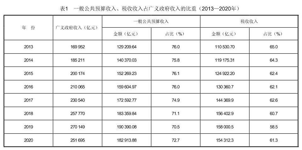 值得注意的是,持续的大规模减税降费也对全口径预算收入结构产生了深刻影响。2013 年,不含国有土地使用权出让收入的政府收入中,税收收入的占比为65.0%,到2020 年降为61.3%;一般公共预算收入的占比由2013 年的76.0% 降至2020 年的72.7%(见表1)。如果将国有土地使用权出让收入计入政府收入,2013年国有土地使用权出让收入为41 638.36 亿元,(19)到2020 年增至84 200.02 亿元,(20)税收收入和一般公共预算收入的占比则由52.2%和61.1%下降至45.9%和54.5%。