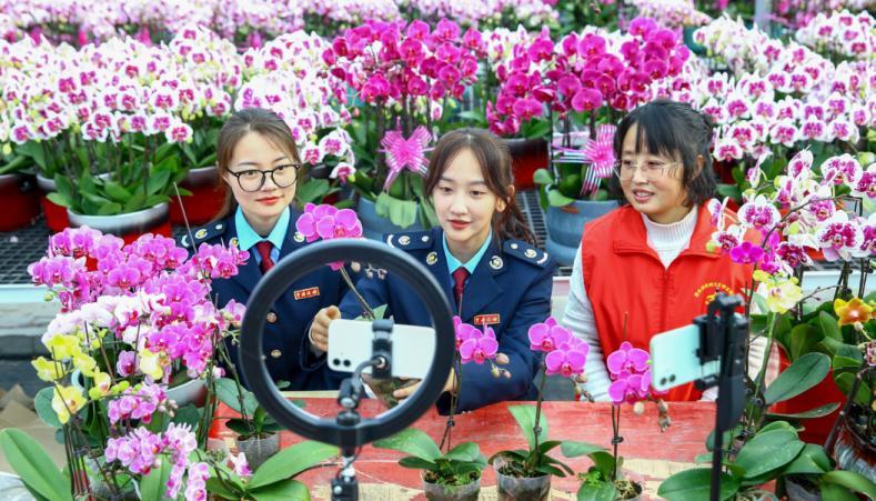 税务干部和青年志愿者通过直播帮助花农销售蝴蝶兰。
