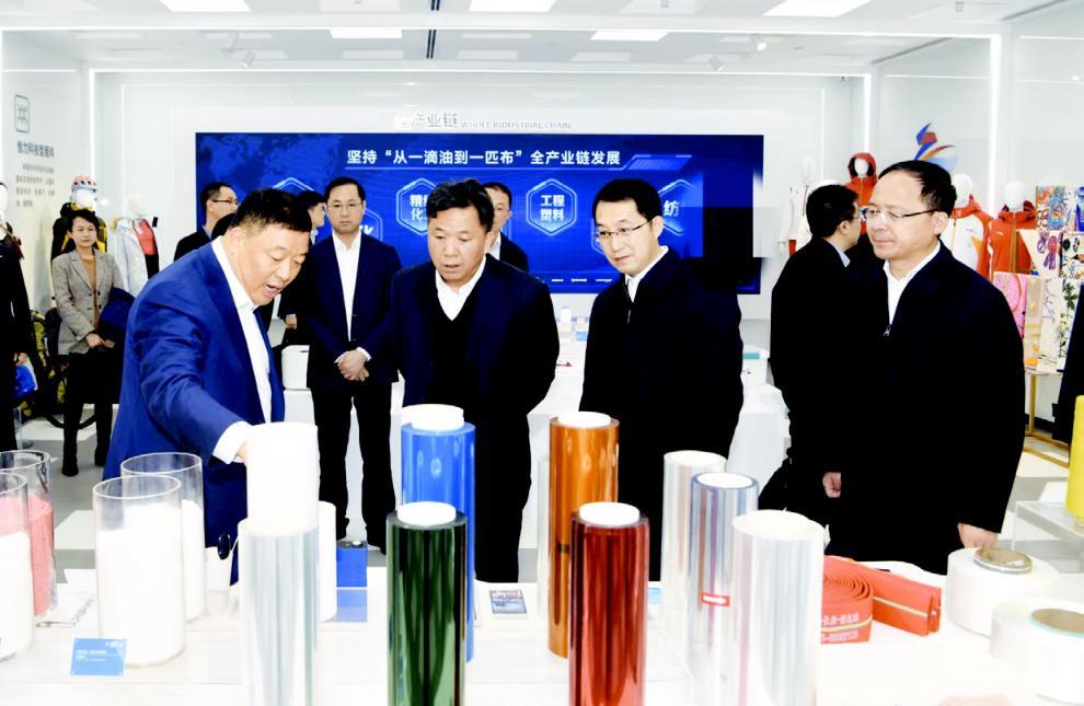 汤志水(前排左二)走进位于苏州吴江的恒力集团,了解企业生产经营情况和企业涉税需求,一对一解答企业涉税疑难问题。图为恒力集团董事会主席陈建华(前排左一)向汤志水介绍3.9 微米超薄基膜及其主要功能。