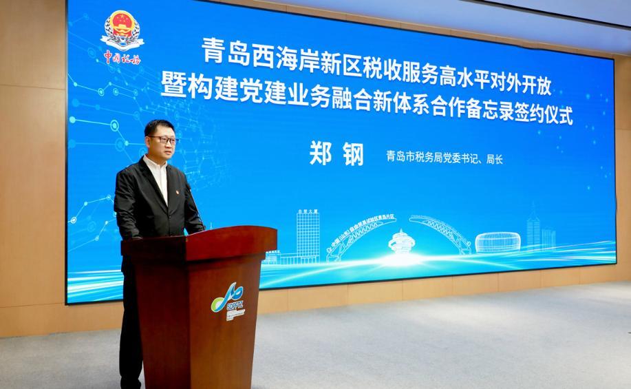 2023 年10 月24 日,青岛市税务部门与青岛自贸片区联合举办税收服务高水平对外开放暨构建党建业务融合新体系合作备忘录签约仪式,国家税务总局青岛市税务局党委书记、局长郑钢出席活动并讲话